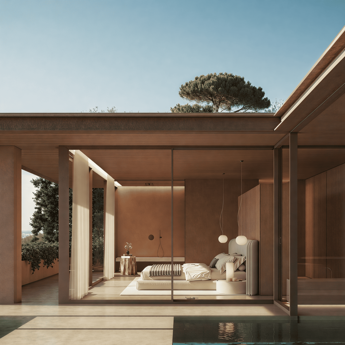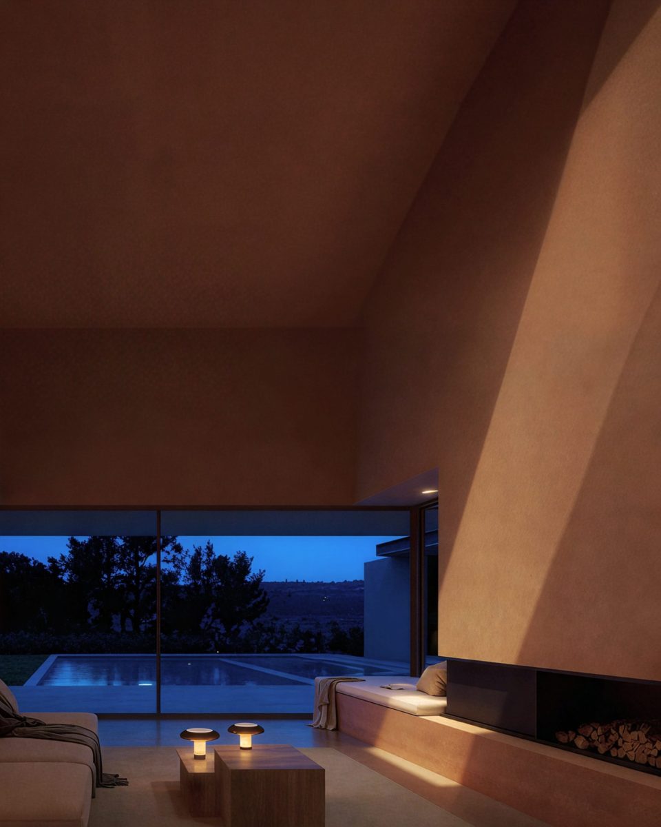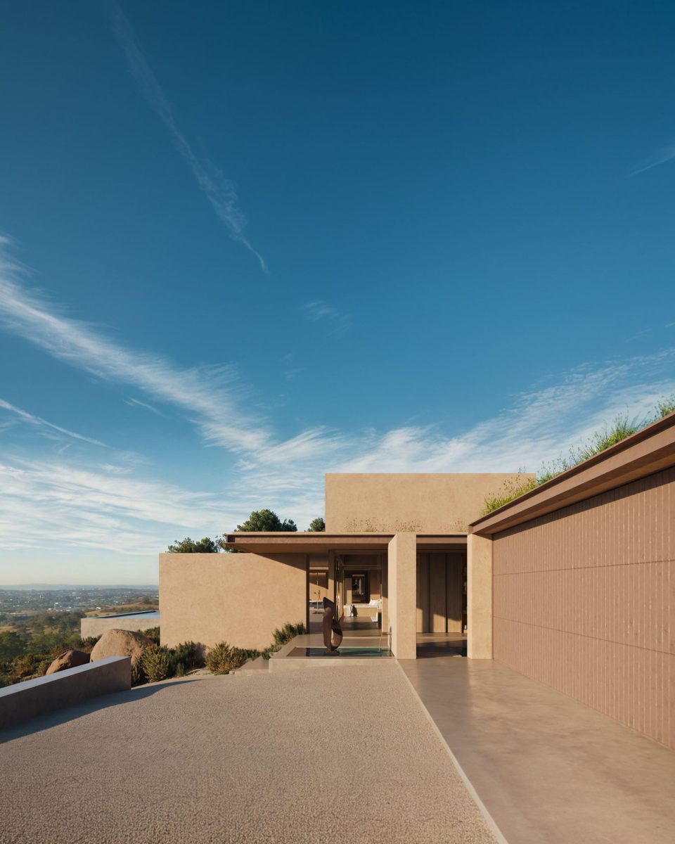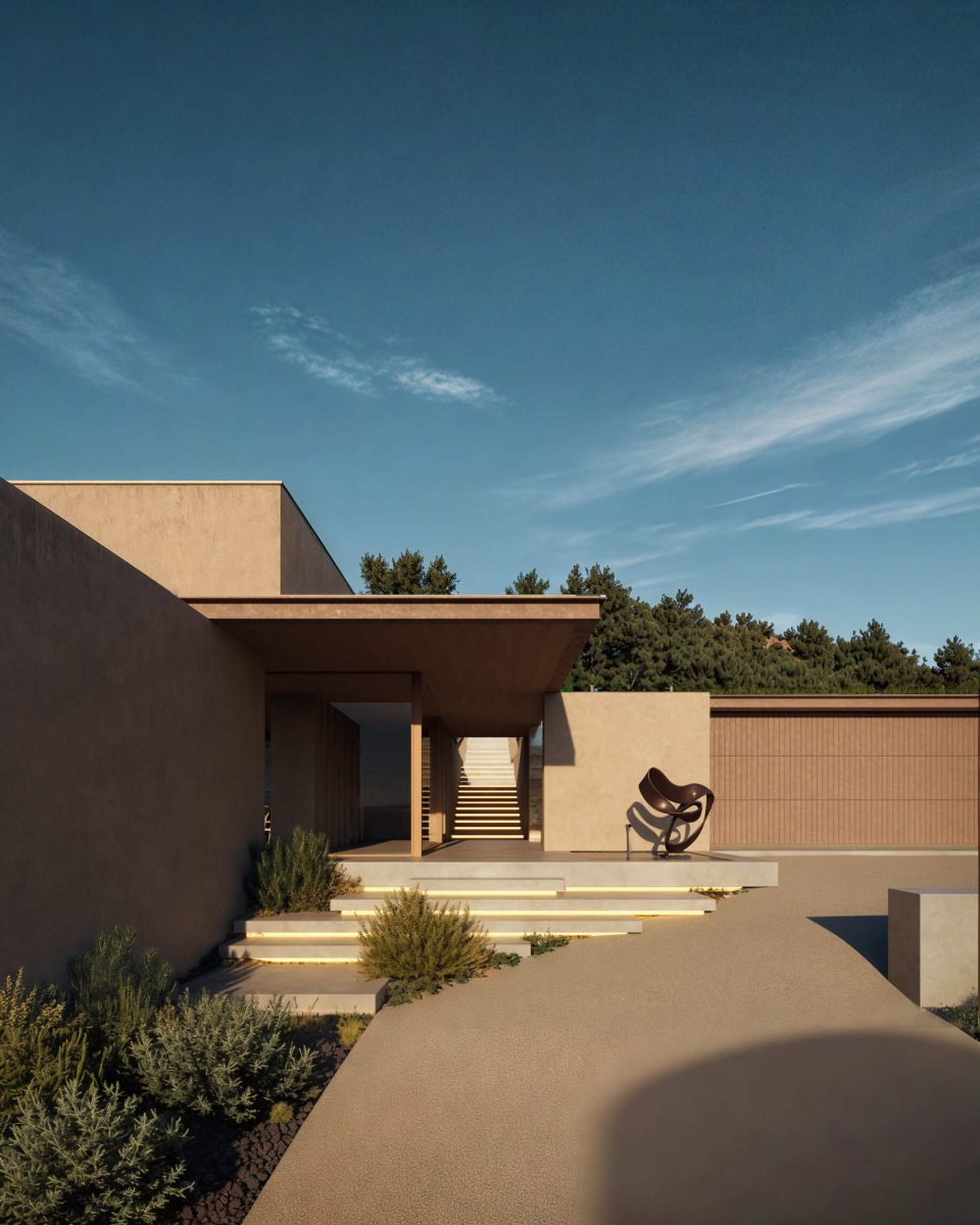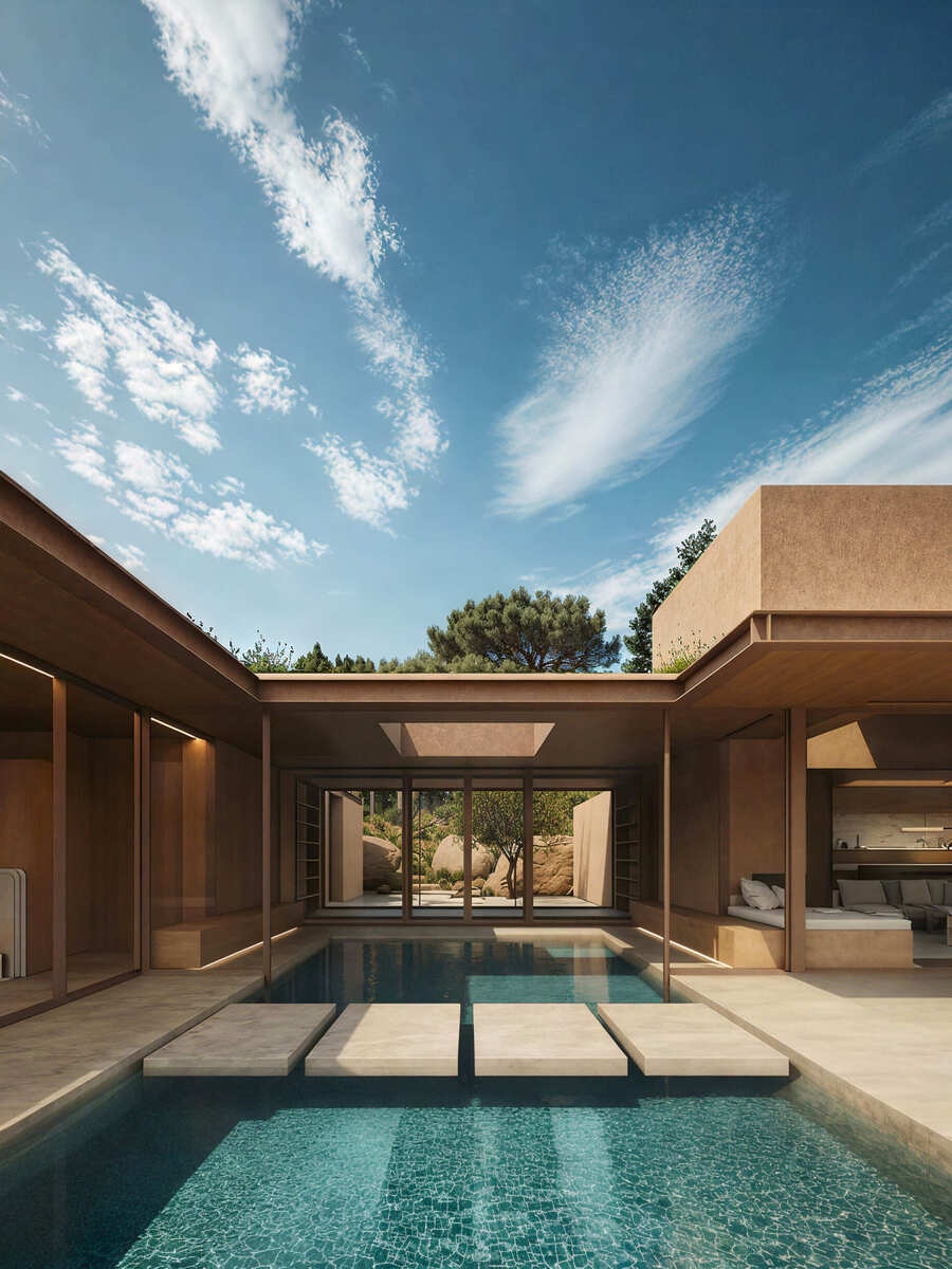 Shaped by the topography, the house creates continuous dialogues between levels, volumes, and extensions. Walls define paths, design intimate corners, and frame the experience of inhabiting. Light, horizon, and water guide each architectural gesture. Water appears in multiple forms — an outdoor pool that flows inward, and reflecting surfaces that mirror the sky, extending space and time.
