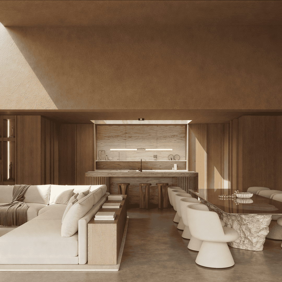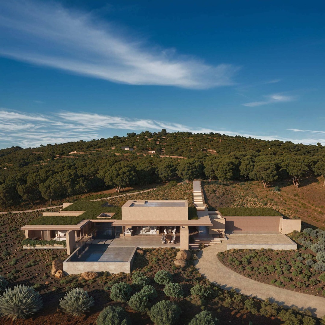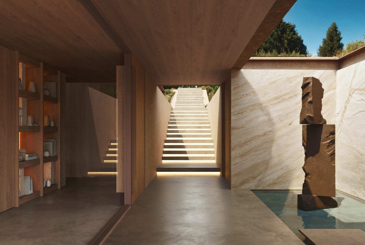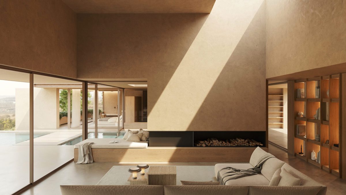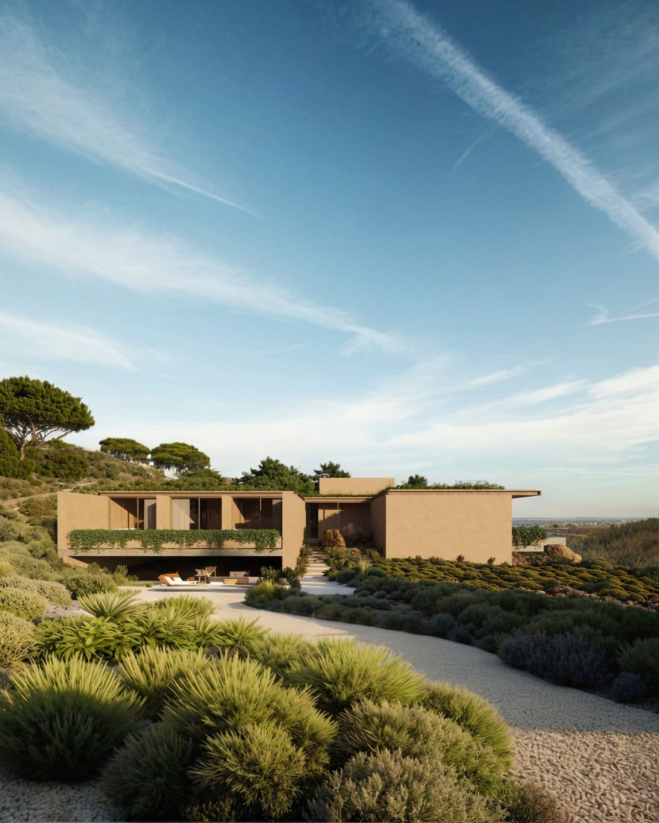 Shaped by the topography, the house creates continuous dialogues between levels, volumes, and extensions. Walls define paths, design intimate corners, and frame the experience of inhabiting. Light, horizon, and water guide each architectural gesture. Water appears in multiple forms — an outdoor pool that flows inward, and reflecting surfaces that mirror the sky, extending space and time.