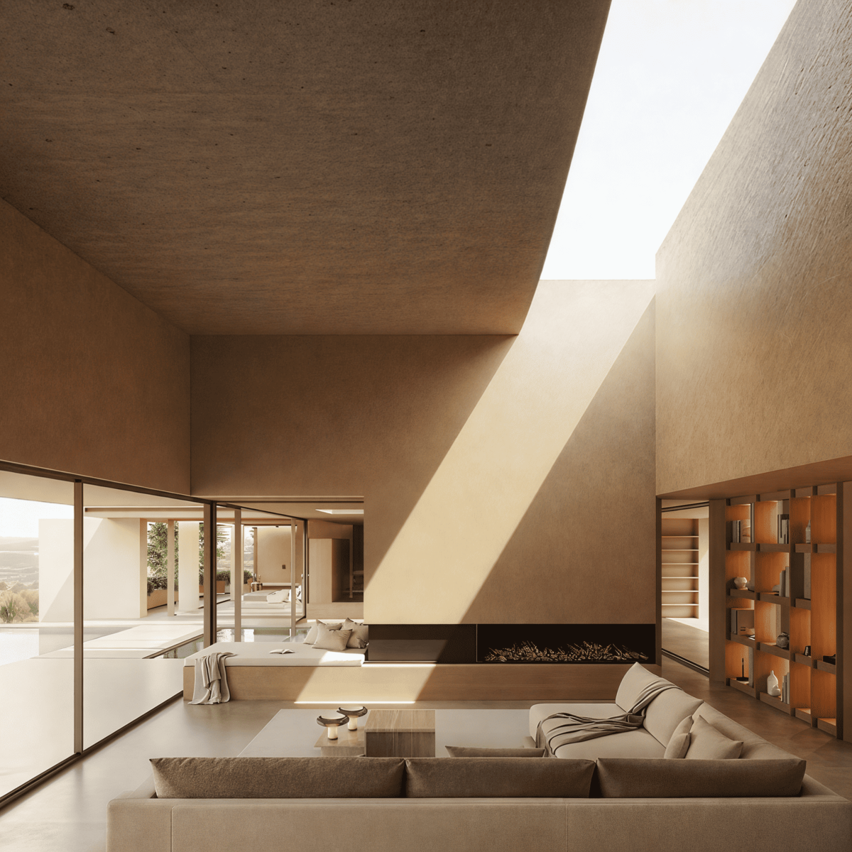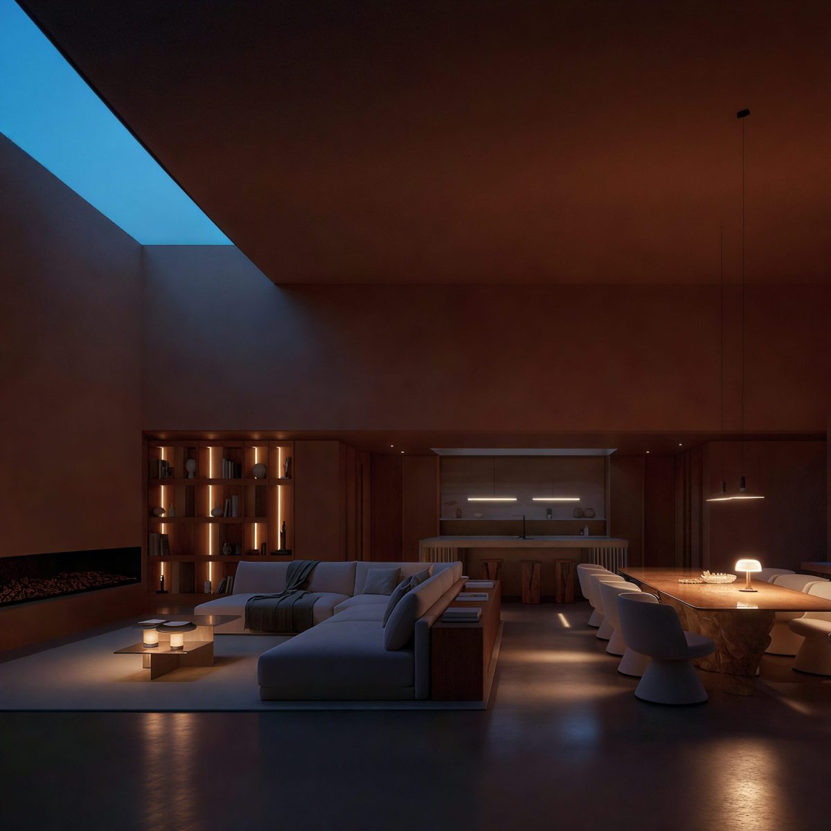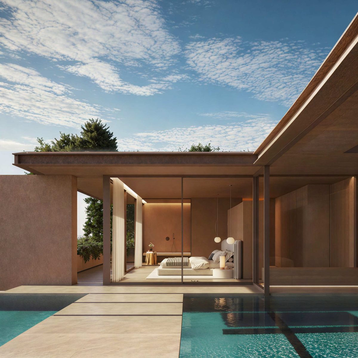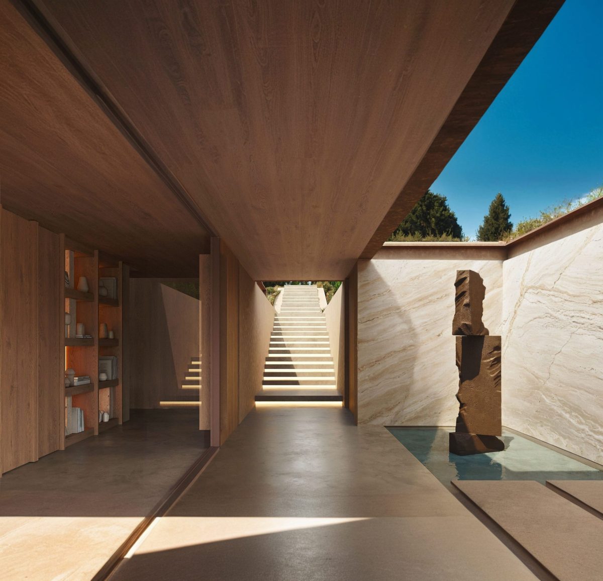 Shaped by the topography, the house creates continuous dialogues between levels, volumes, and extensions. Walls define paths, design intimate corners, and frame the experience of inhabiting. Light, horizon, and water guide each architectural gesture. Water appears in multiple forms — an outdoor pool that flows inward, and reflecting surfaces that mirror the sky, extending space and time.