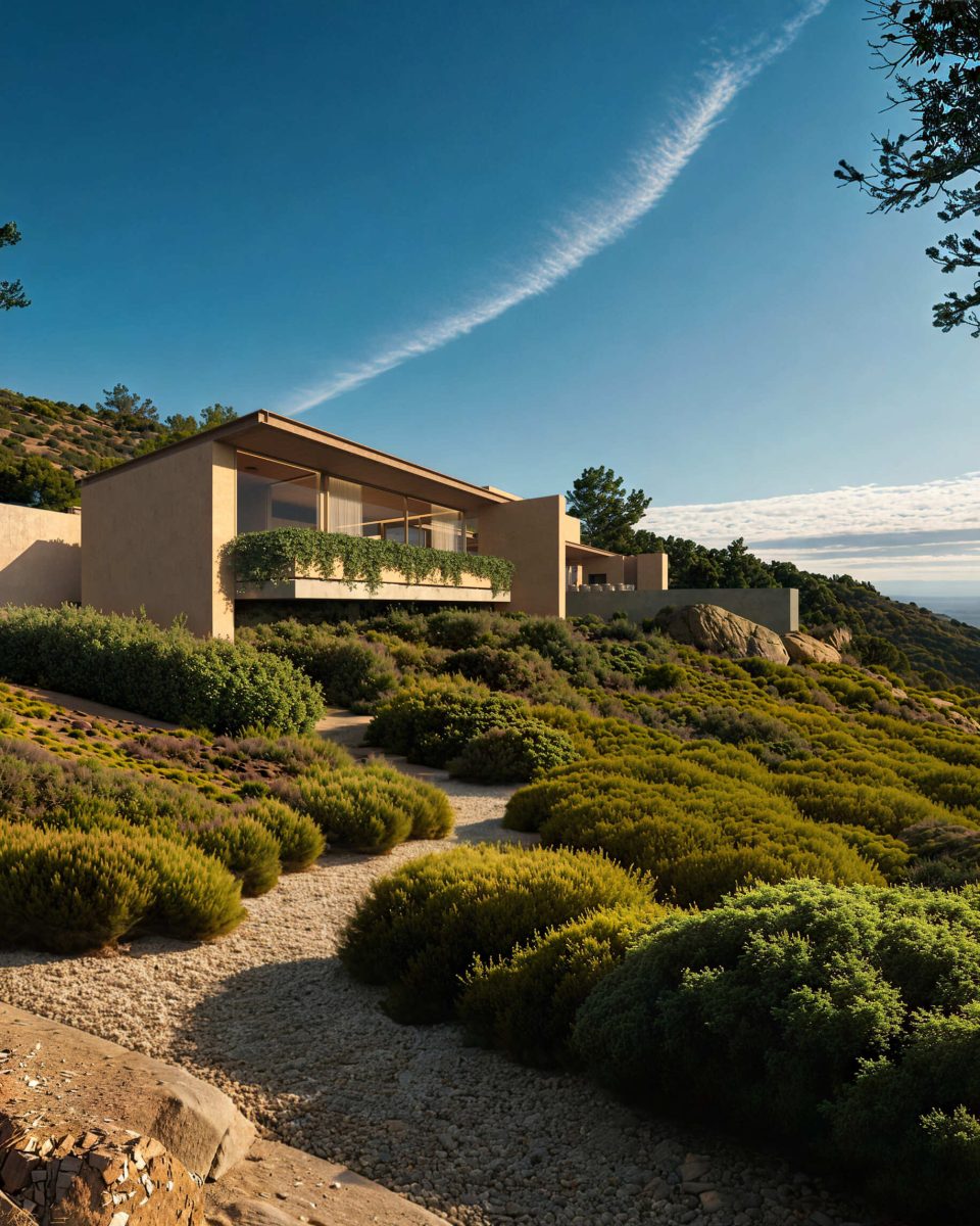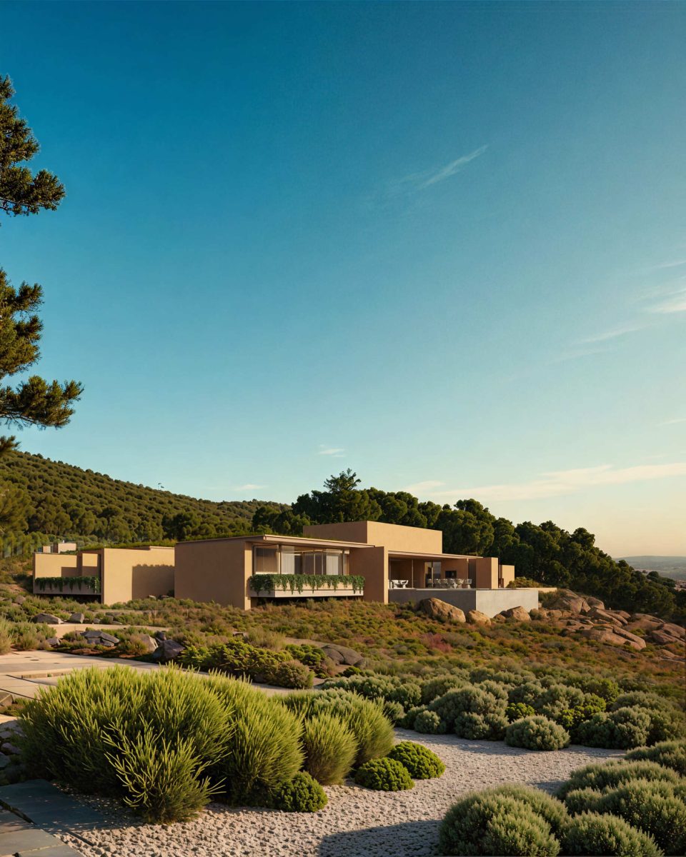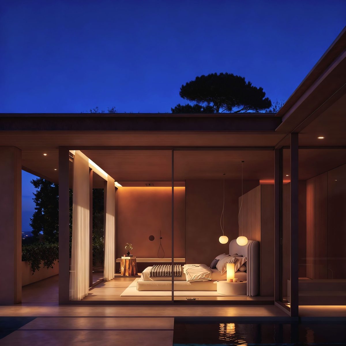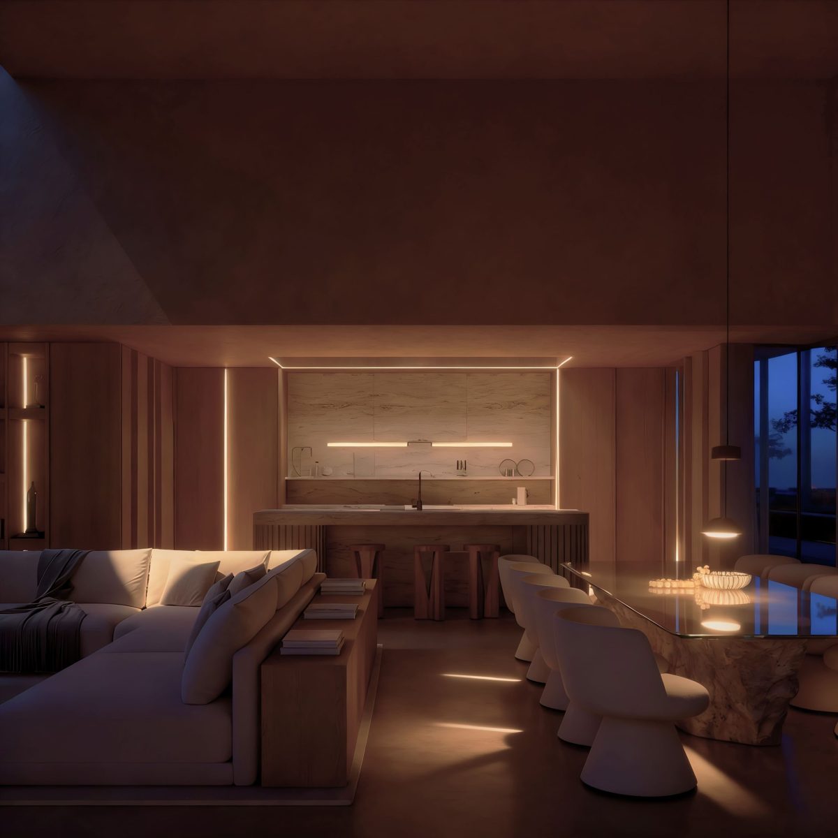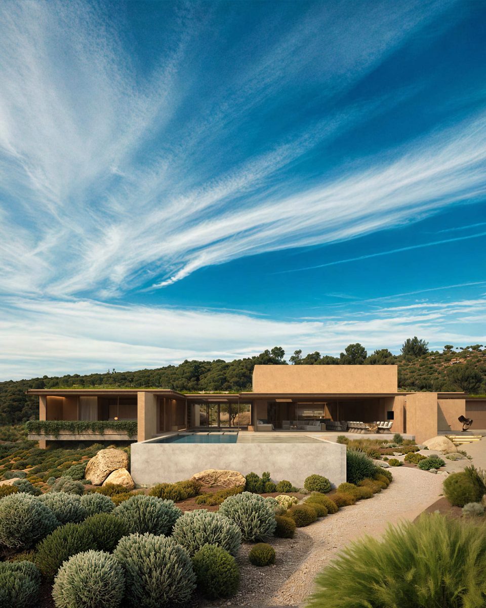 Shaped by the topography, the house creates continuous dialogues between levels, volumes, and extensions. Walls define paths, design intimate corners, and frame the experience of inhabiting. Light, horizon, and water guide each architectural gesture. Water appears in multiple forms — an outdoor pool that flows inward, and reflecting surfaces that mirror the sky, extending space and time.