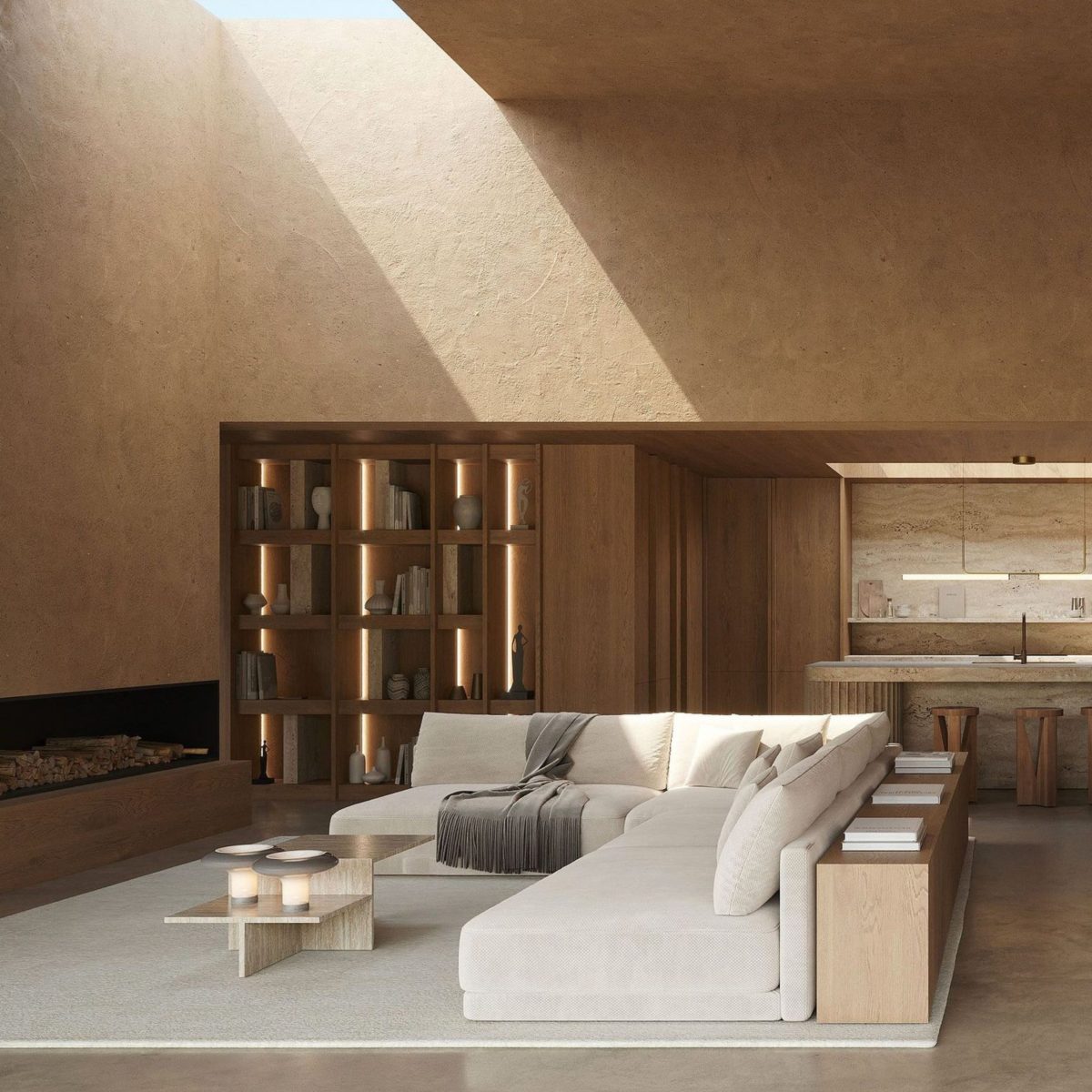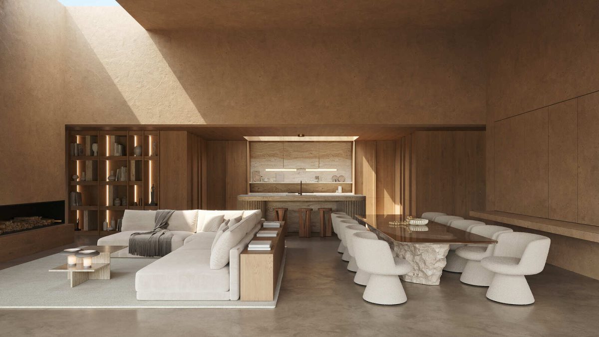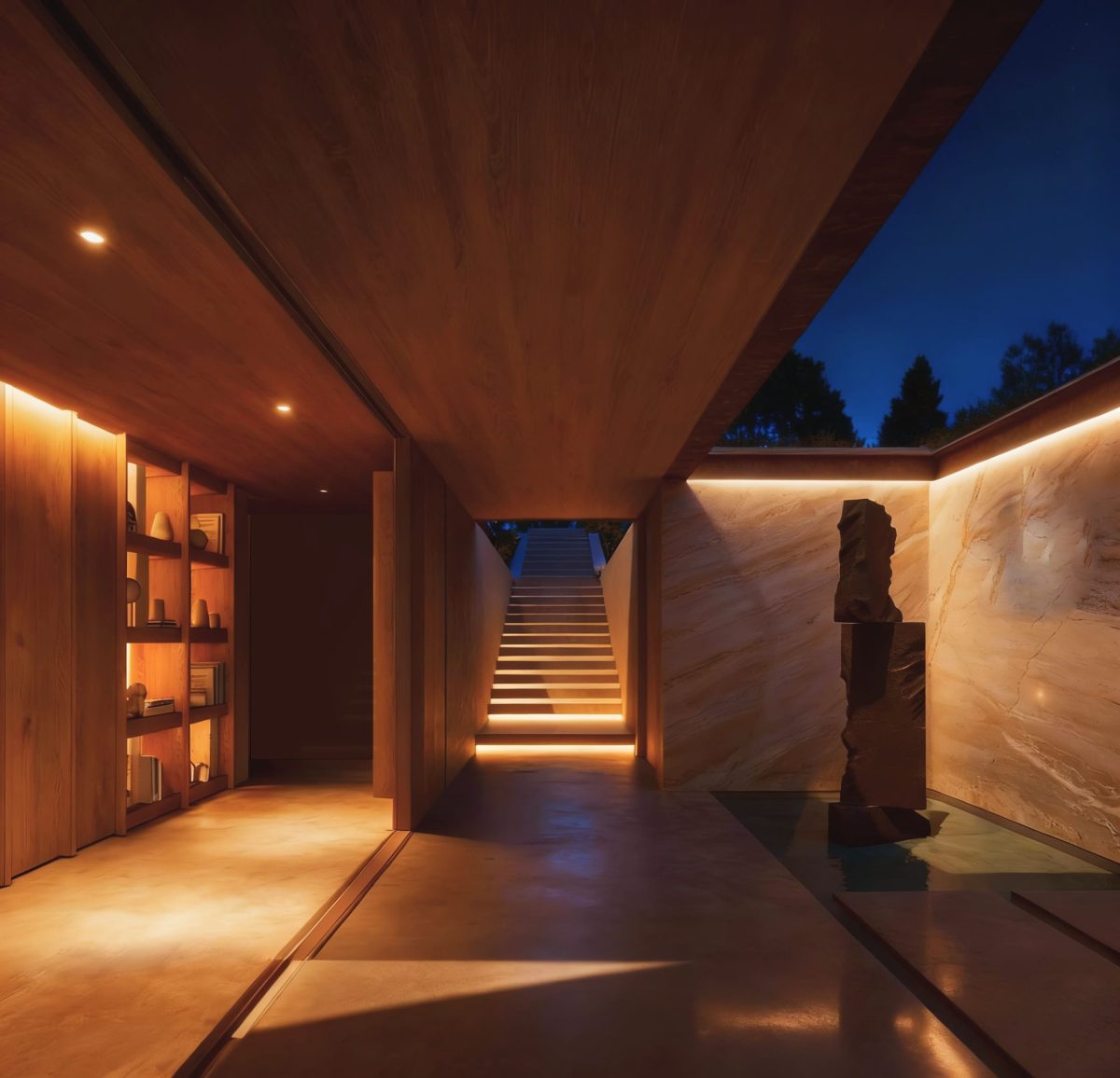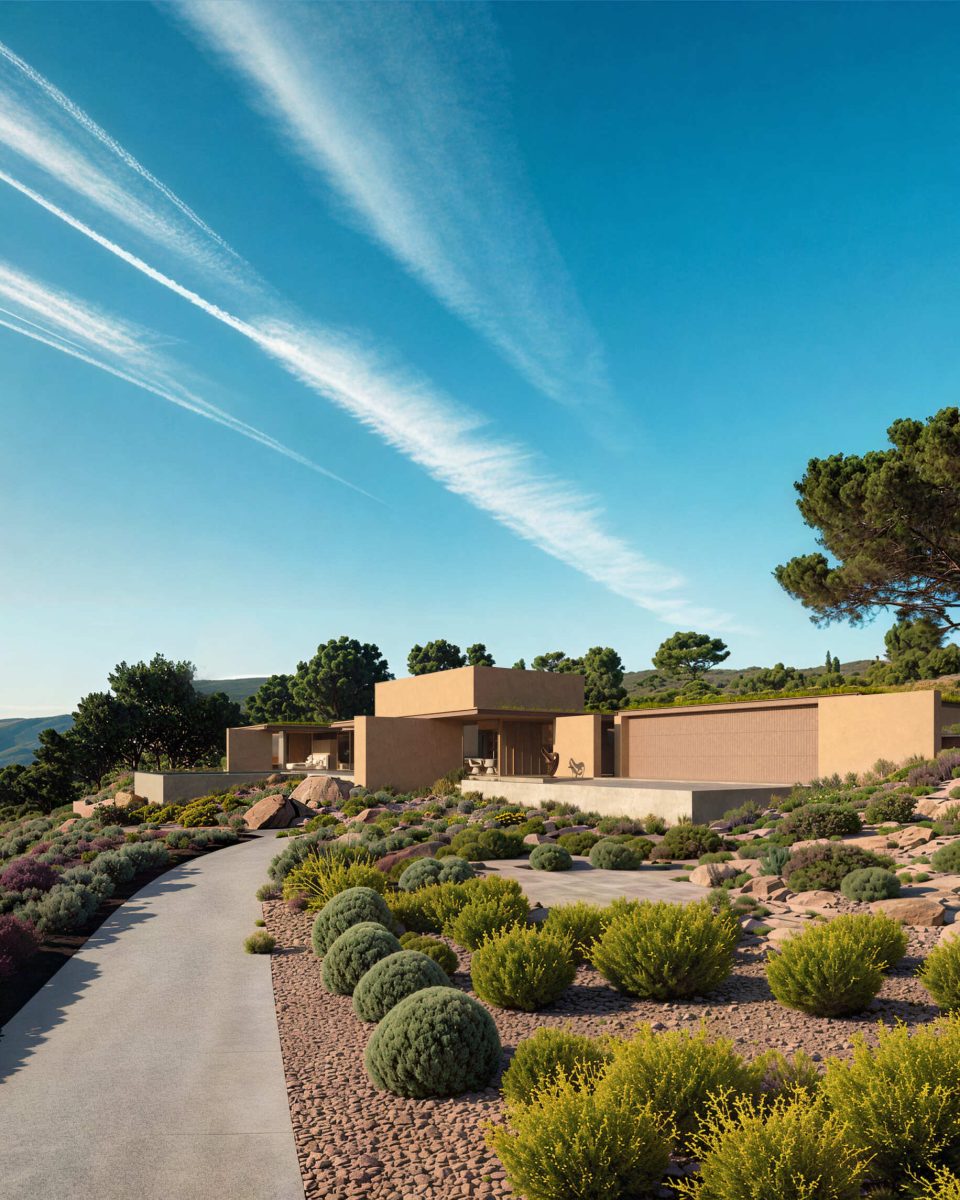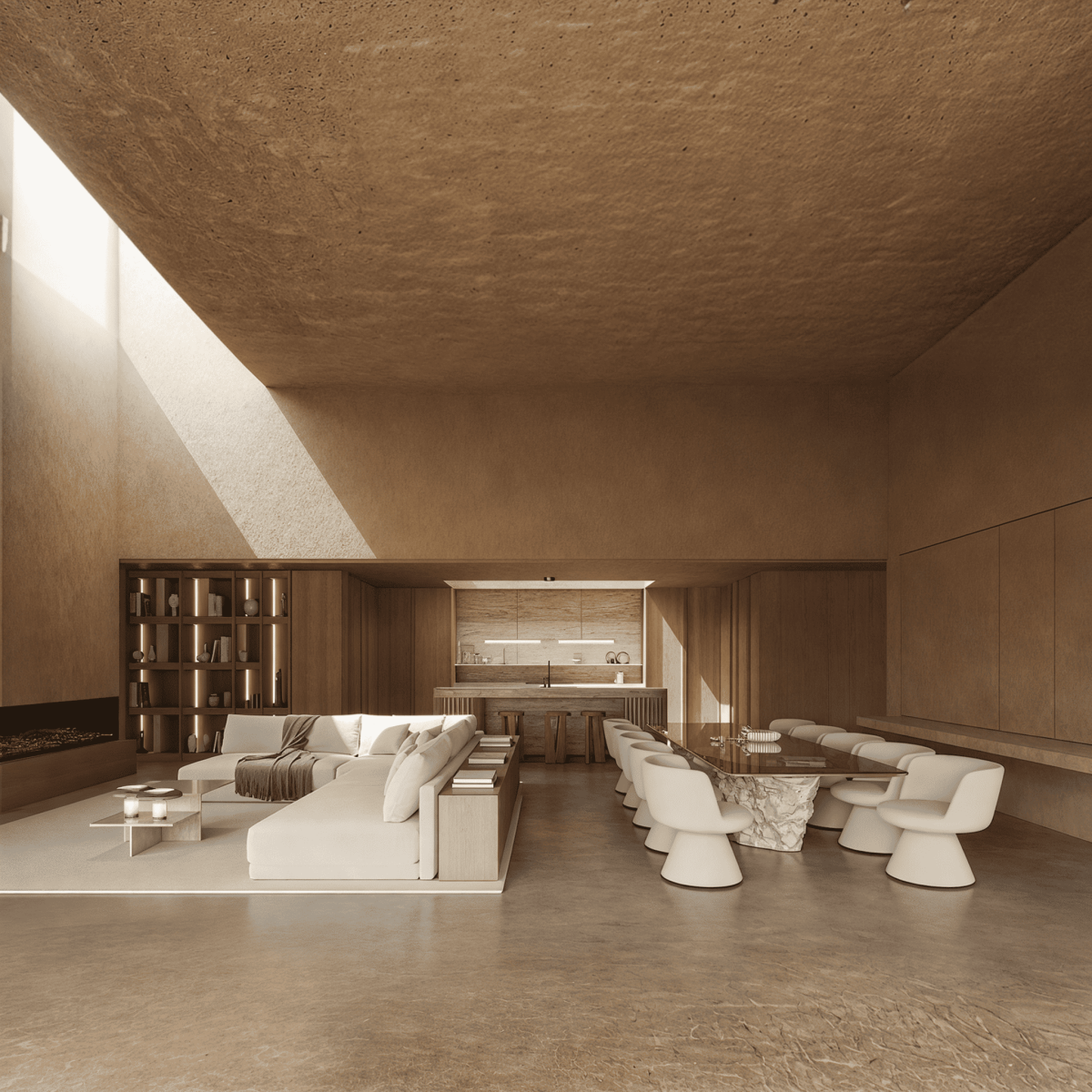 Shaped by the topography, the house creates continuous dialogues between levels, volumes, and extensions. Walls define paths, design intimate corners, and frame the experience of inhabiting. Light, horizon, and water guide each architectural gesture. Water appears in multiple forms — an outdoor pool that flows inward, and reflecting surfaces that mirror the sky, extending space and time.