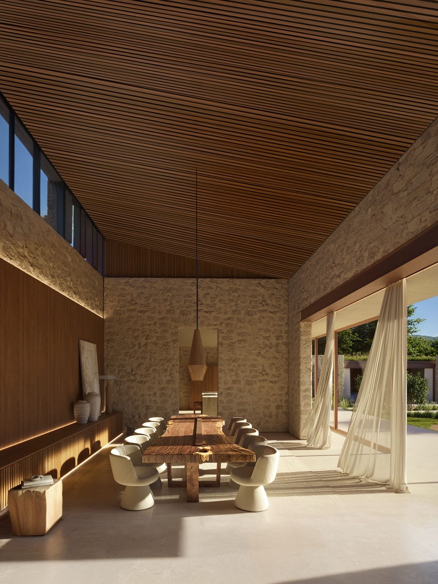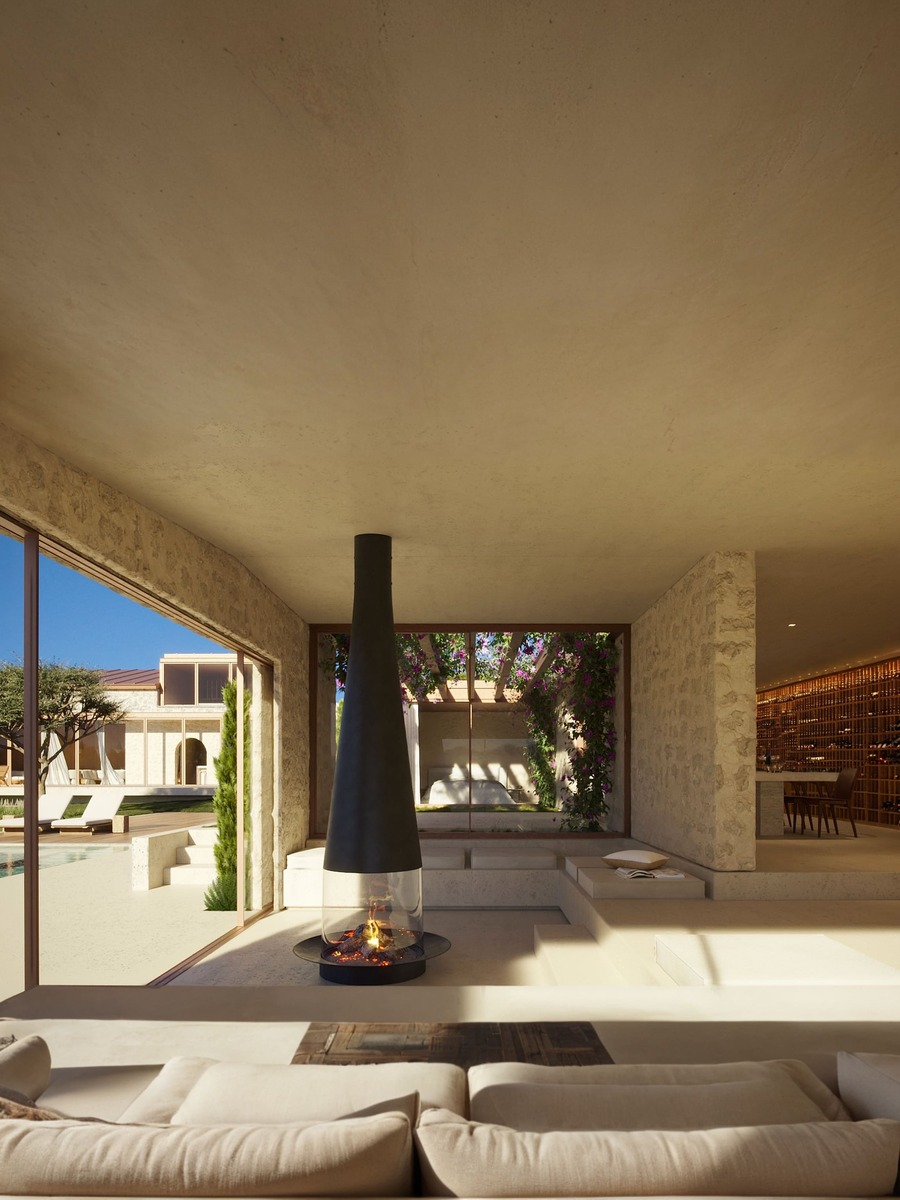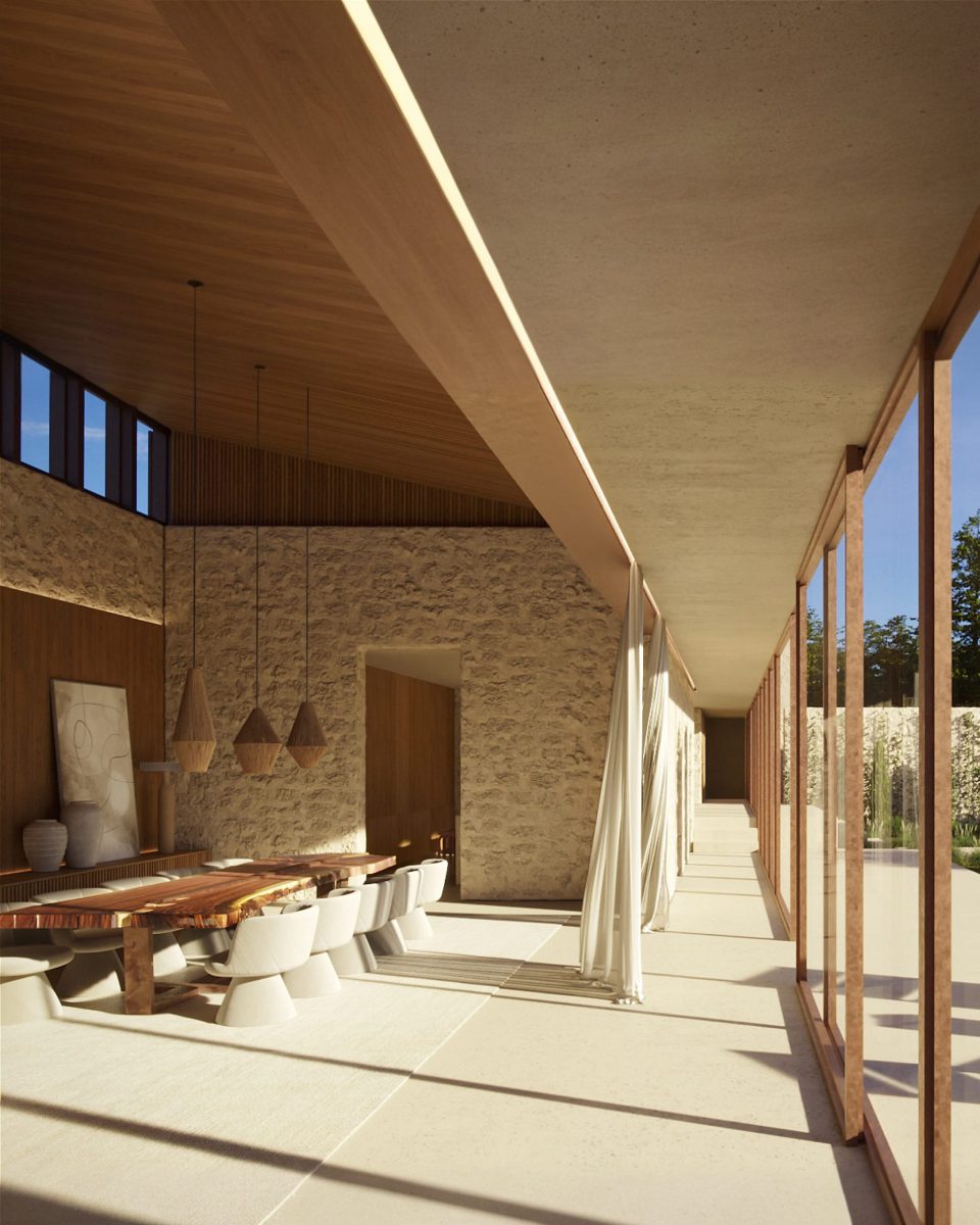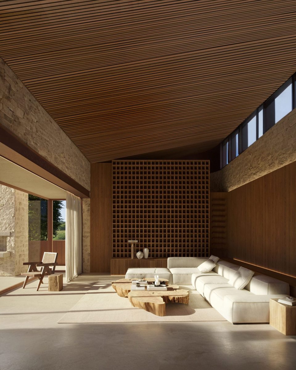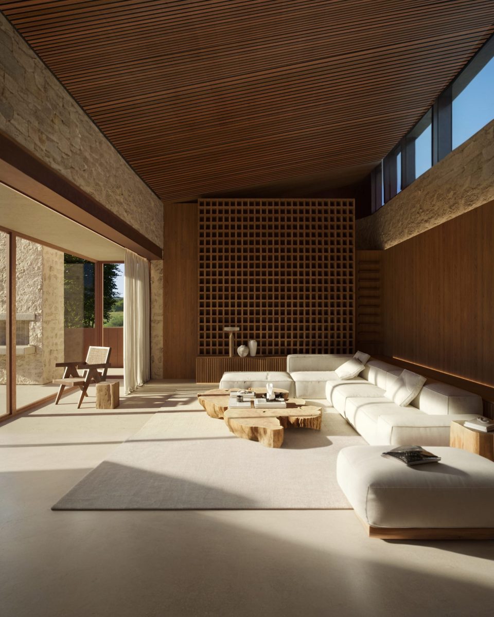 Light flows freely through every opening, softening boundaries and connecting the house to its landscape. The result is a space that embraces calm living, where silence, texture, and materiality shape an atmosphere of pure balance.