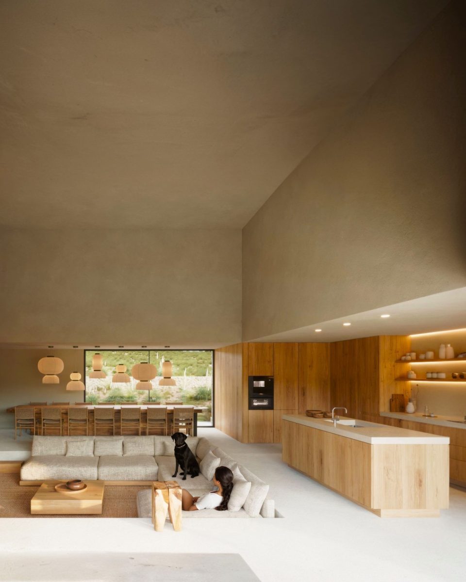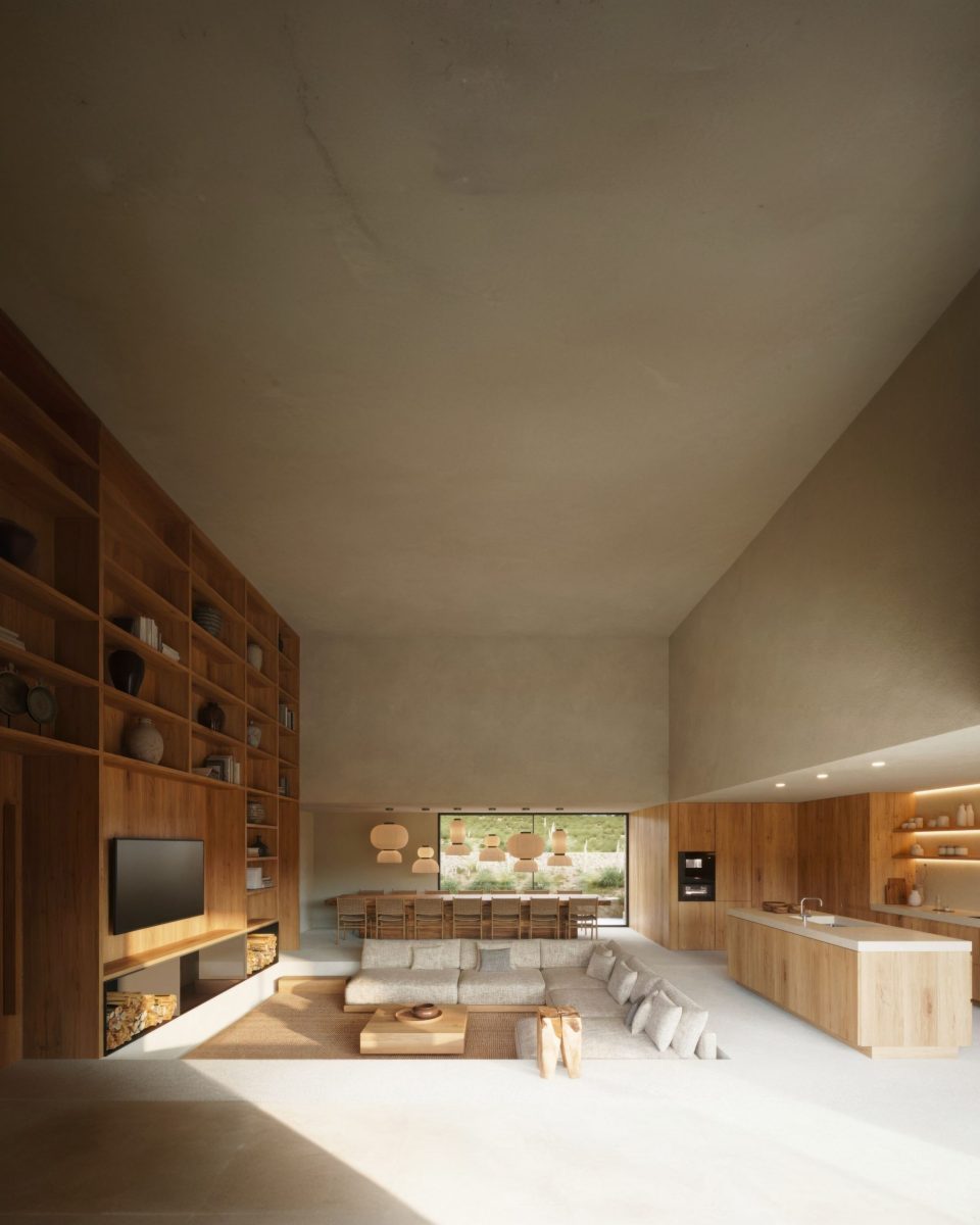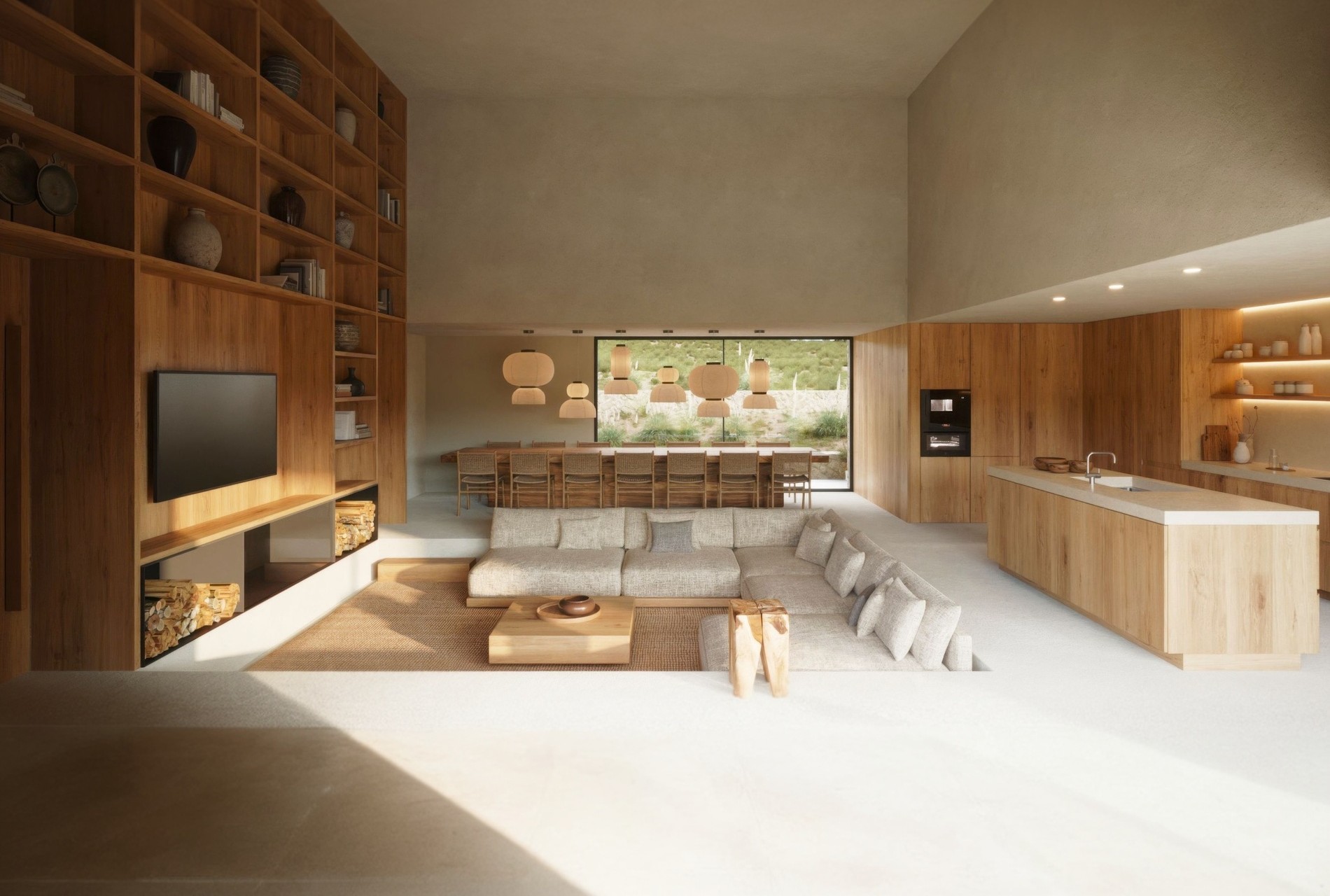 Its low, elongated volume rests on the natural terrain, preserving the topography and minimizing impact. The social area — the heart of the project — opens through a continuous glass front that dissolves boundaries between inside and outside. Living room, kitchen, and terrace merge into a single space, crossed by light and framed by the mountain horizon.