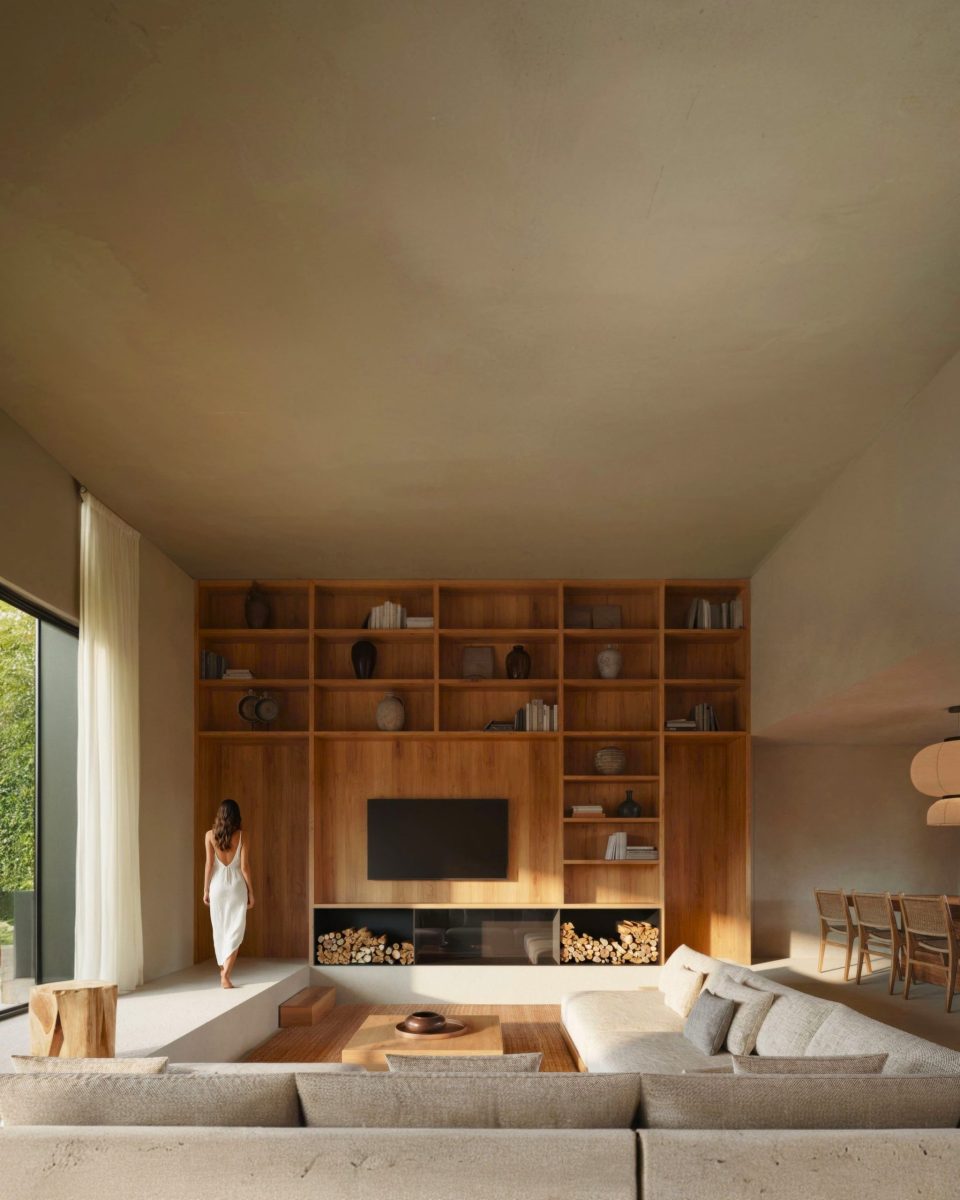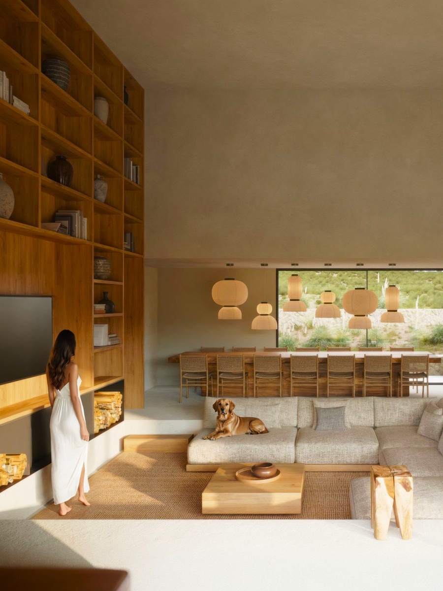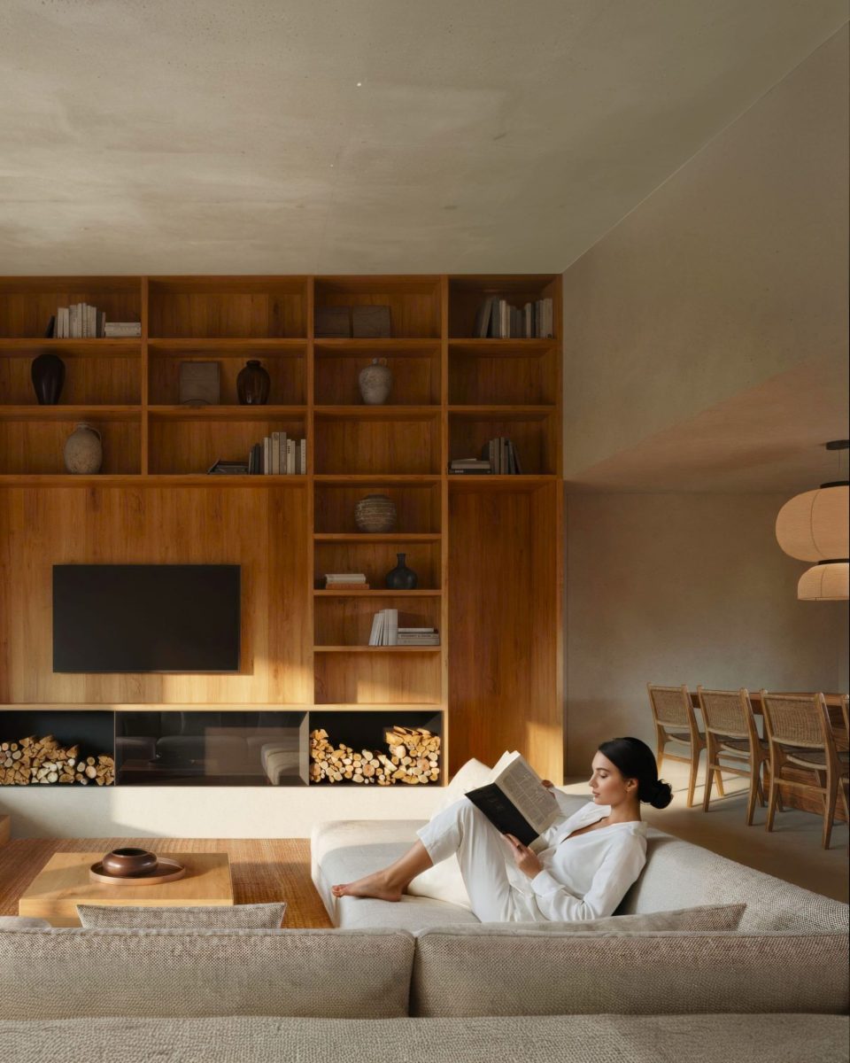 Its low, elongated volume rests on the natural terrain, preserving the topography and minimizing impact. The social area — the heart of the project — opens through a continuous glass front that dissolves boundaries between inside and outside. Living room, kitchen, and terrace merge into a single space, crossed by light and framed by the mountain horizon.