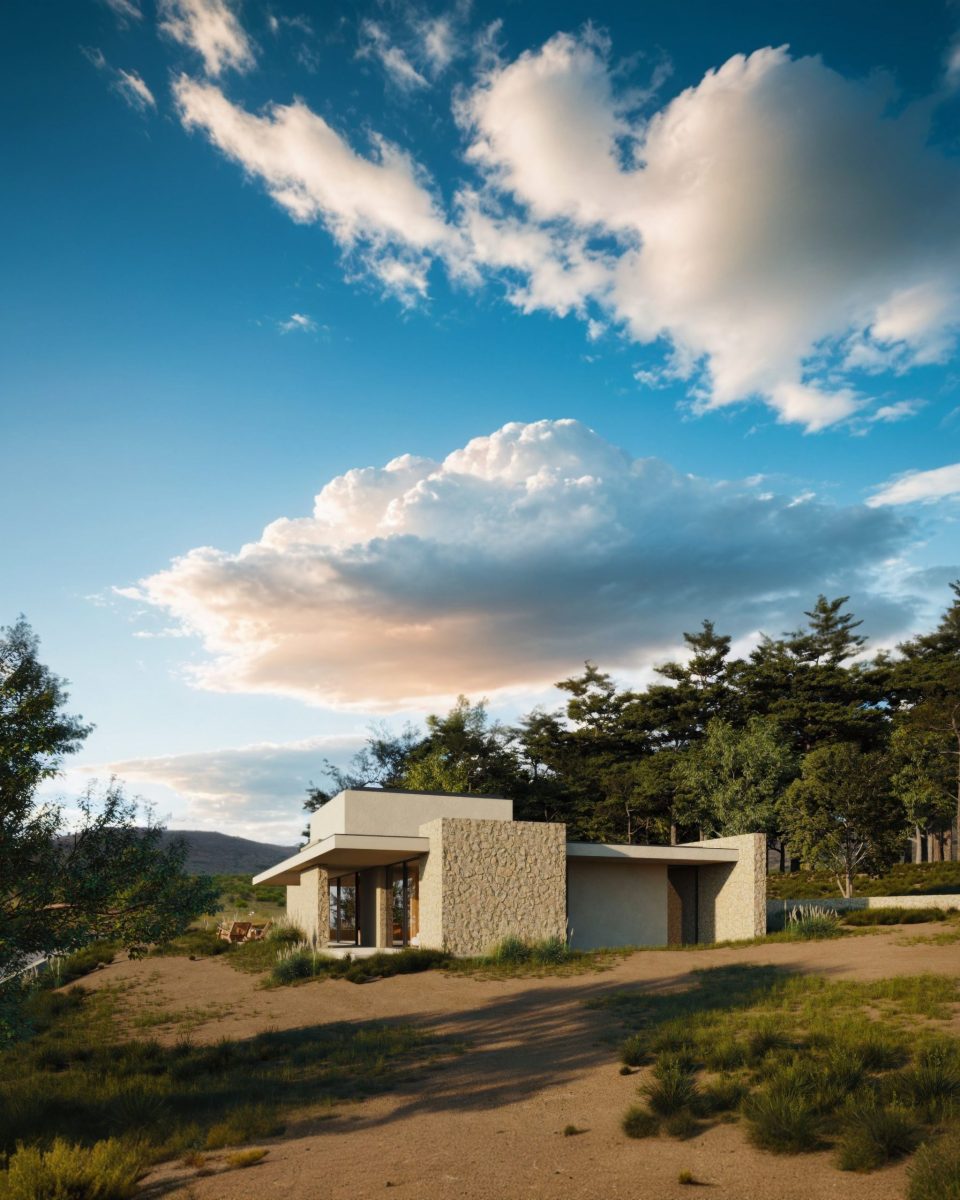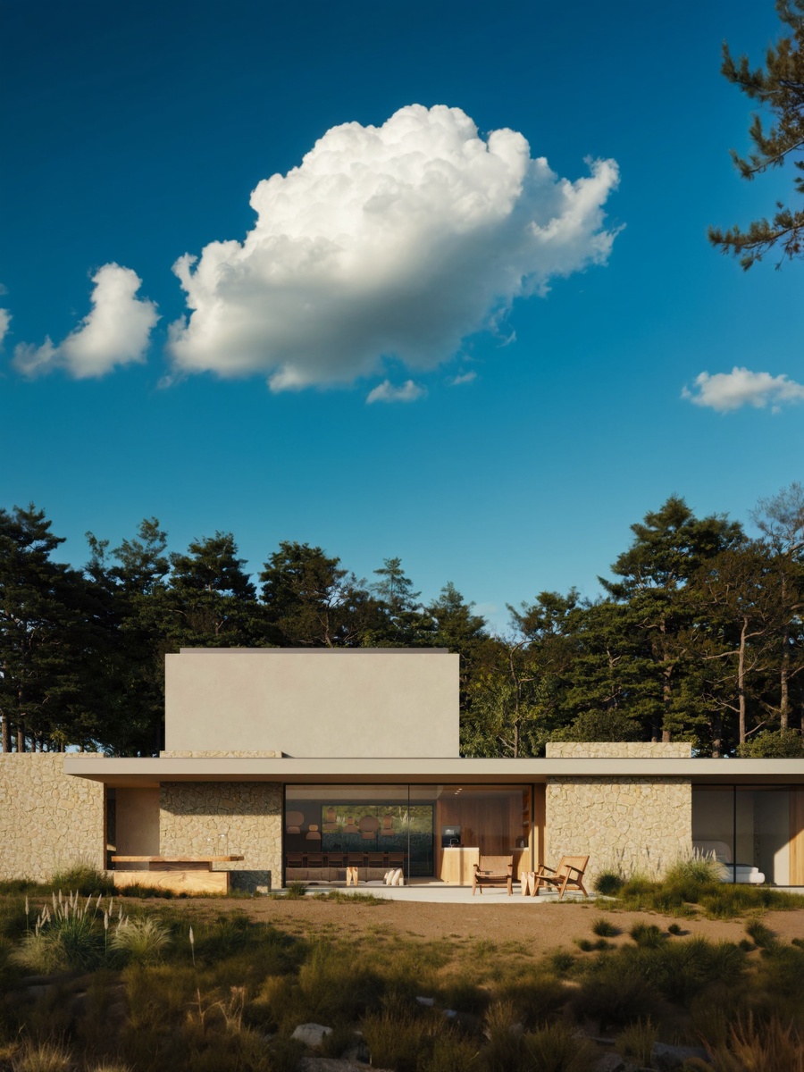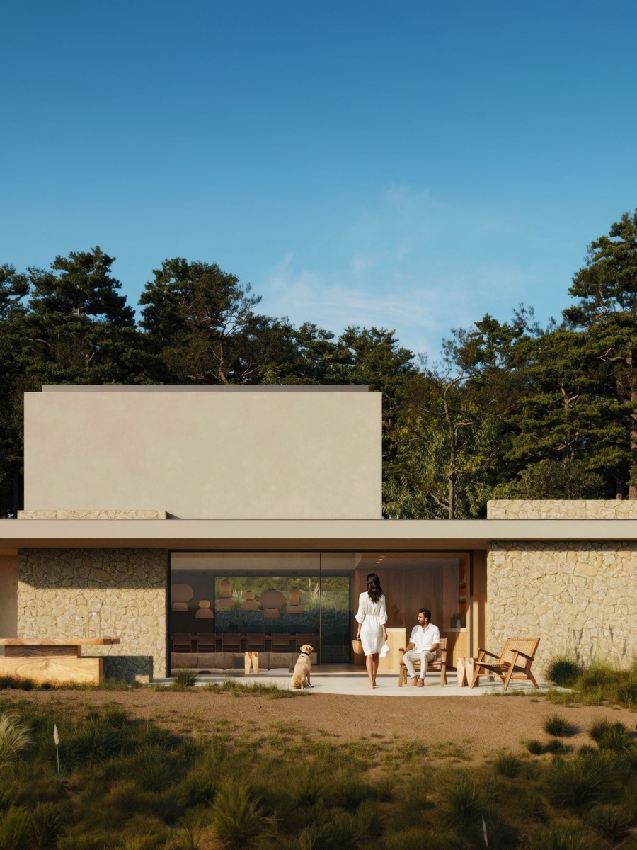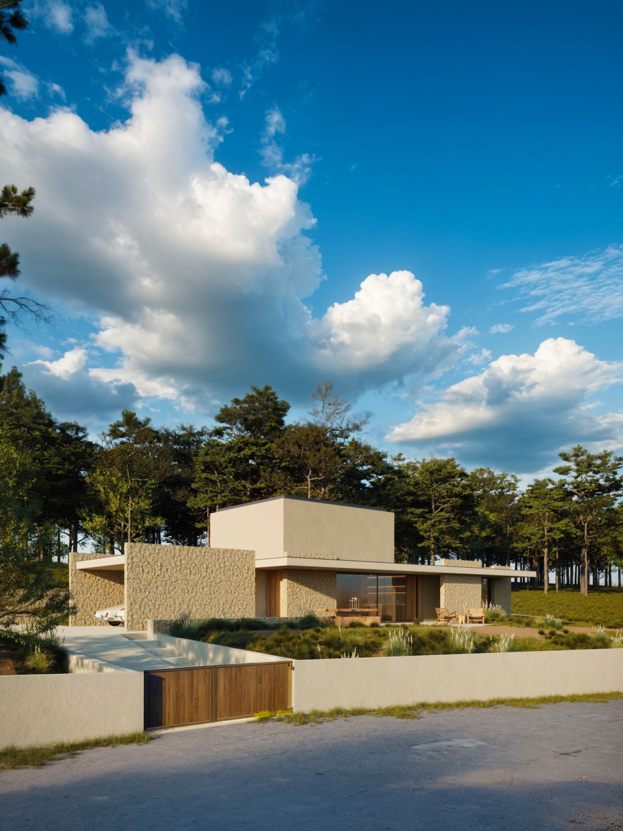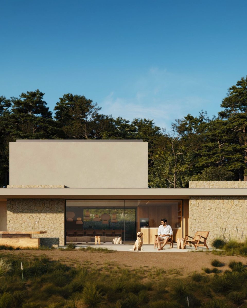 The design combines the minimalism of concrete planes with the rustic strength of local stone, handcrafted with full joints, and the transparency of glass. Wood, used in select details, adds warmth and texture, balancing the refined coolness of the other materials. Together, stone, glass, concrete, and wood form a simple palette that evolves in harmony with the changing climate and surrounding vegetation.