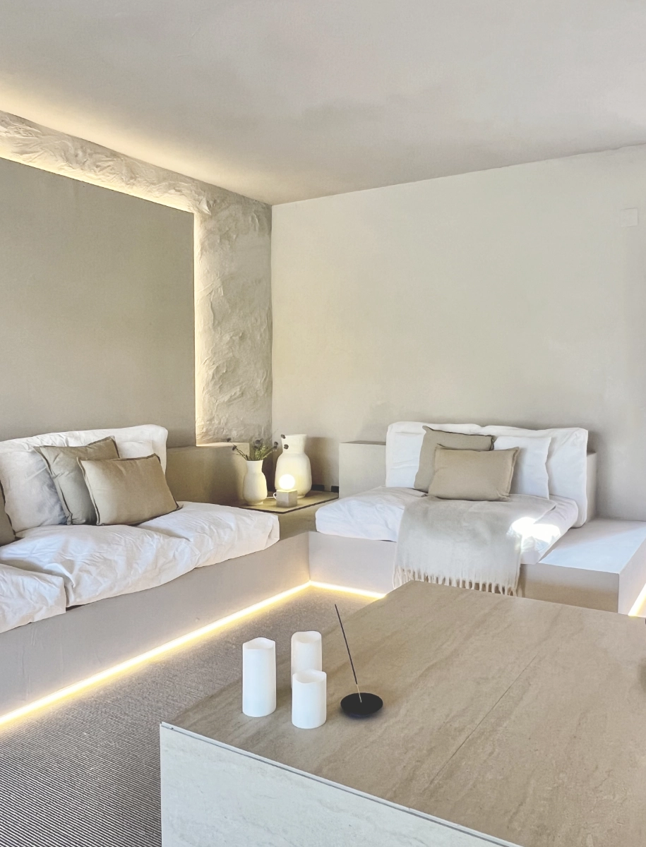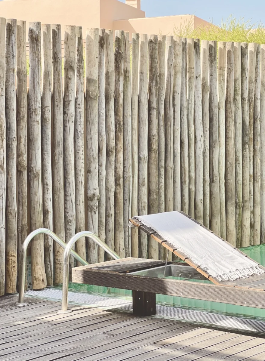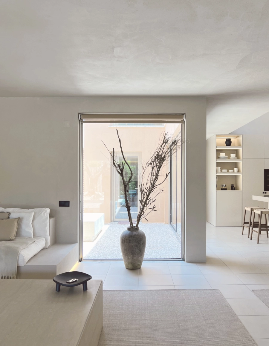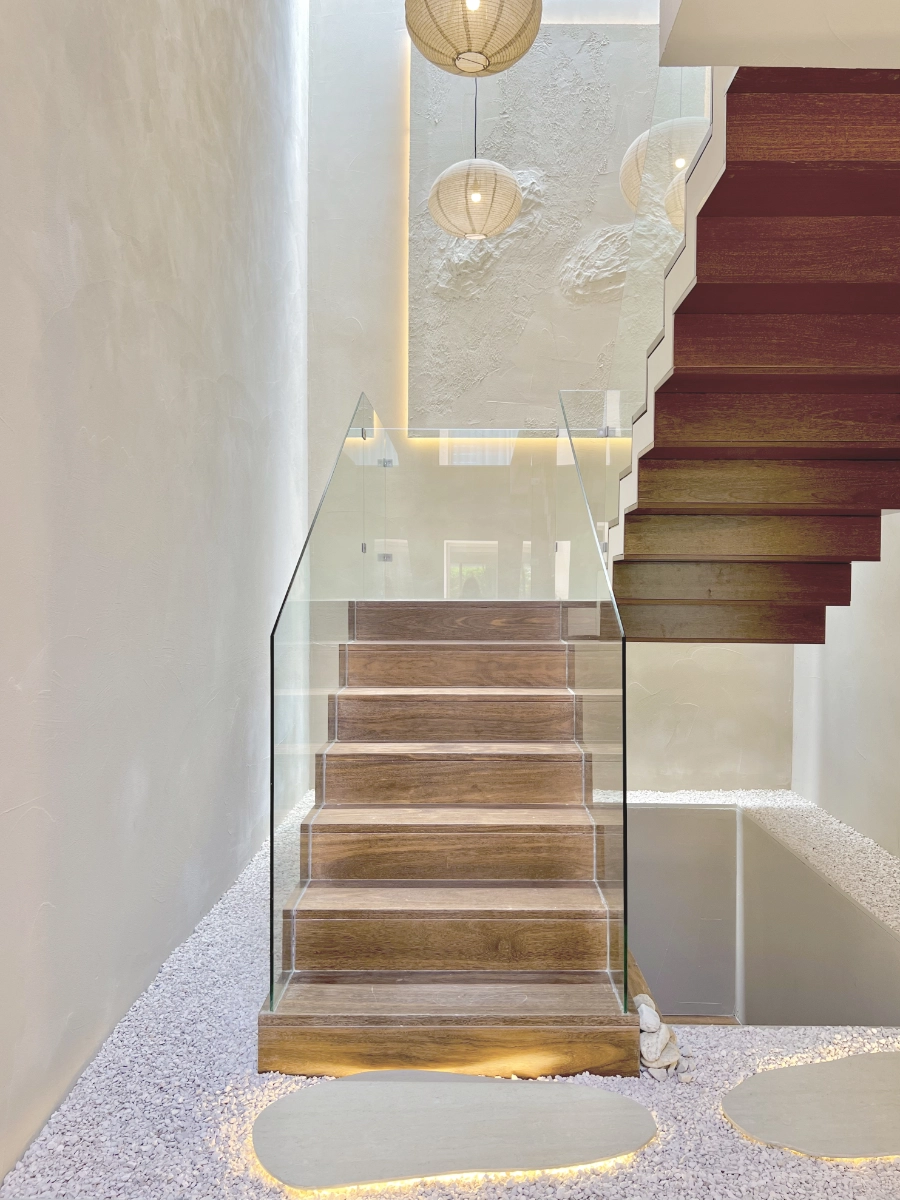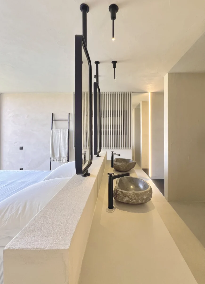 Biophilia serves as the foundation of the design, with a garden and pool area surrounded by natural elements like wood, creating privacy while fostering a deep connection to the environment. The entire project embraces the slow living philosophy, incorporating raw, natural textures and allowing materials to evoke the sensations and memories of the place.